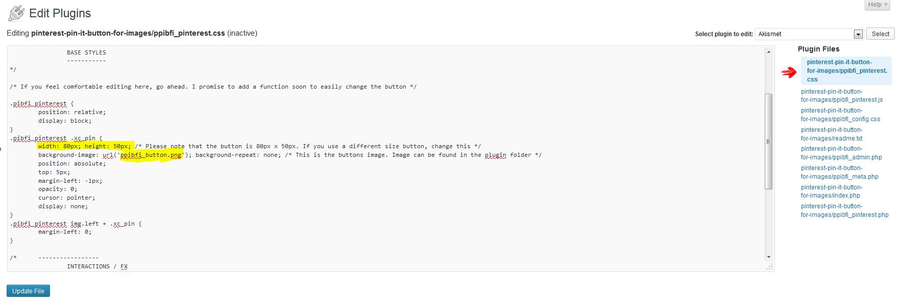 From the list with all source files we select ppibfi_pinterest.css and we update the image url and the its size, both highlighted in yellow.
